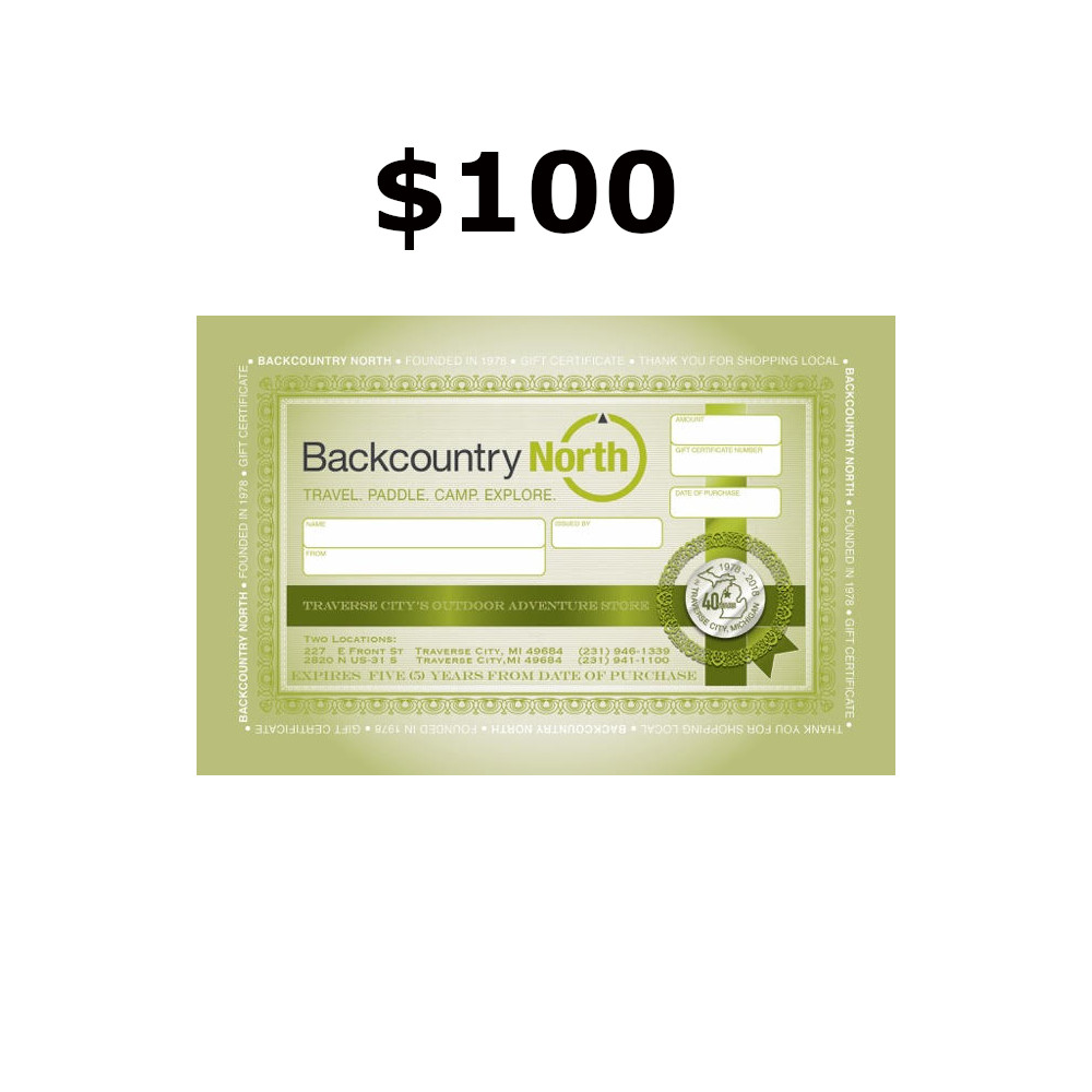 This Backcountry North Gift Certificate is perfect for the recipient who has everything! Gift Certificates can be used to purchase a wide variety of equipment, apparel and footwear from brands such as Patagonia, Smartwool, MSR, The North Face, Keen, Sorel, Osprey, Yeti, Outdoor Research and many more. Available in various denominations, this $100 gift certificate can be used for phone orders or in-store at either Traverse City Backcountry North location.