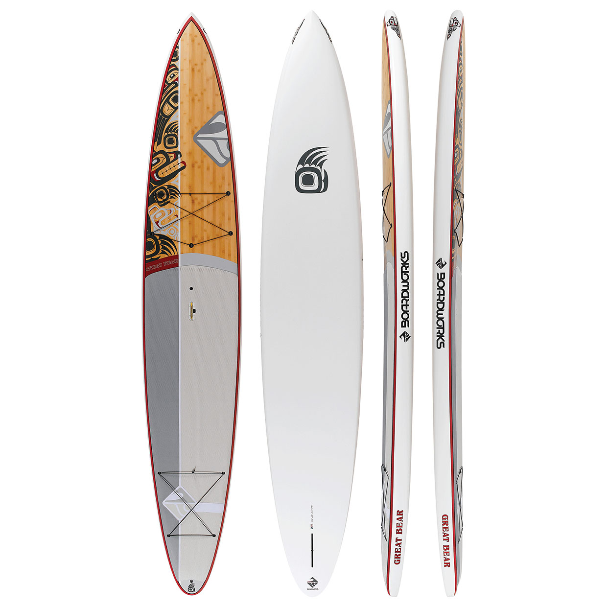 The Great Bear is the ultimate touring and expedition board, created for long or middle distance paddles in calm or open water conditions, and works equally well in flat water or through heavy chop and wind. The revolutionary bow and hull shape creates glide and tracking that performs better than any board in this category. At 29” wide the Great Bear creates a fast yet stable platform giving you confidence under load and keeping you from tiring on those longer expeditions. The Great Bear is genuinely the ultimate touring board for exploring your local waterways. With stability, speed, and the space to carry as much gear as needed, the Great Bear will take you anywhere you want to go.