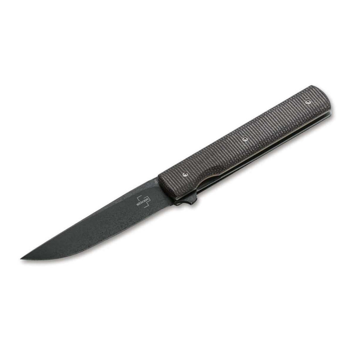 The Boker Plus Urban Trapper, designed by Brad Zinker, is equipped with a reliable linerlock in this somewhat more tangible version and is thus available with an additional locking mechanism. The elegant pocket knife is equipped with a dark stonewash blade made of VG-10, which is hollow-ground and can be opened by a flipper with ball bearings. The pleasantly textured handle scales are made of green canvas Micarta and always fit securely in the hand. The spacer and the stable titanium liners are anodised in a brass colour and thus match the colour of the deep carry clip (tip-up/r), which is also made of titanium. With high-quality nylon case for storage.