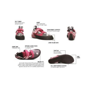The Elektra is one of the best selling low-volume climbing shoes in the world. Anatomical fit that is great for beginners and advanced climbers coupled with great looks make it a no-brainer for a first time or repeat buyer. The Synthratek VX upper and Agion Antimicrobial liner ensure lasting comfort and odor protection. The Split tongue and dual hook and loop closure system provide easy accessibility and a secure fit.