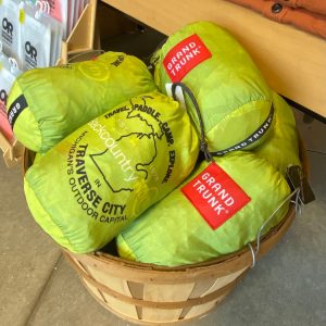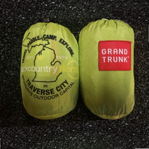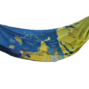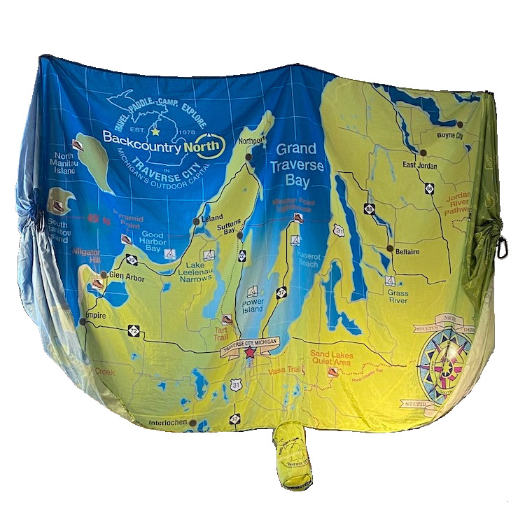 Bring a slice of Traverse City with you on your next adventure! Relax in comfort while overlooking Lake Michigan, count stars in the backyard, or snuggle your pup in this versatile hammock. Backcountry North teamed with Grand Trunk to create this unique Northern Michigan hammock. Pictured on this creative map are staff favorite hikes and paddle locations.