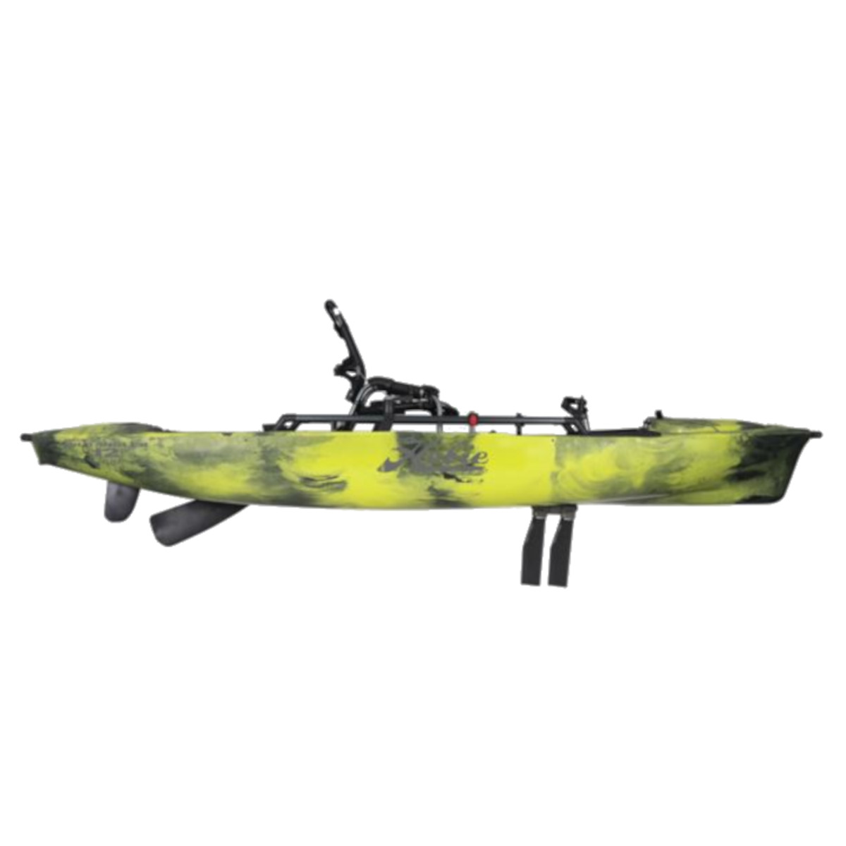 With the revolutionary MirageDrive 360 and Kick-Up fins, move through the water without constraints, going exactly where you want to go. Effortlessly spin and move in every direction. Hobie’s patented Kick-Up Fins immediately retract on impact – even shallow areas are now entirely navigable. Logs, kelp, shallows, rocks? No problem. The PA 12 is packed full of features including six rod holders, fully adjustable and ultra comfortable elevated Vantage ST seat with BOA lumbar support, Guardian retractable transducer shield, H-Rail for easy integration with accessories, front and center hatch with stain-resistant EVA grip pads, dual steering and extra wide hull for maximum stability.