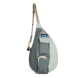 Mini sling pack with adjustable rope shoulder strap, two vertical zip compartments, two key or cell phone pockets, padded back with KAVU embroidery.