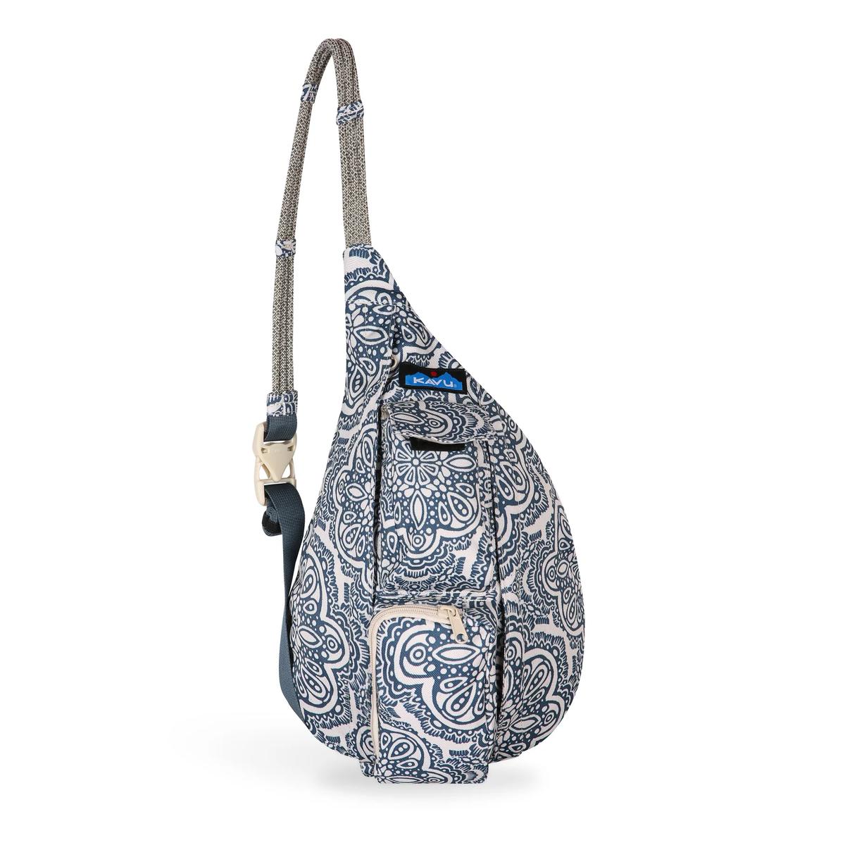 On the heels of the Rope Bag's smash success, our design crew created this beauty by using a Rope Bag blueprint reinforced with a durable and vibrant 600D poly fabric with water resistance. And, now it's packaged in a mini. This polyester mini sling pack features an adjustable rope shoulder strap and side release buckle, two vertical zip compartments, two key or cell phone pockets, padded back with KAVU embroidery.