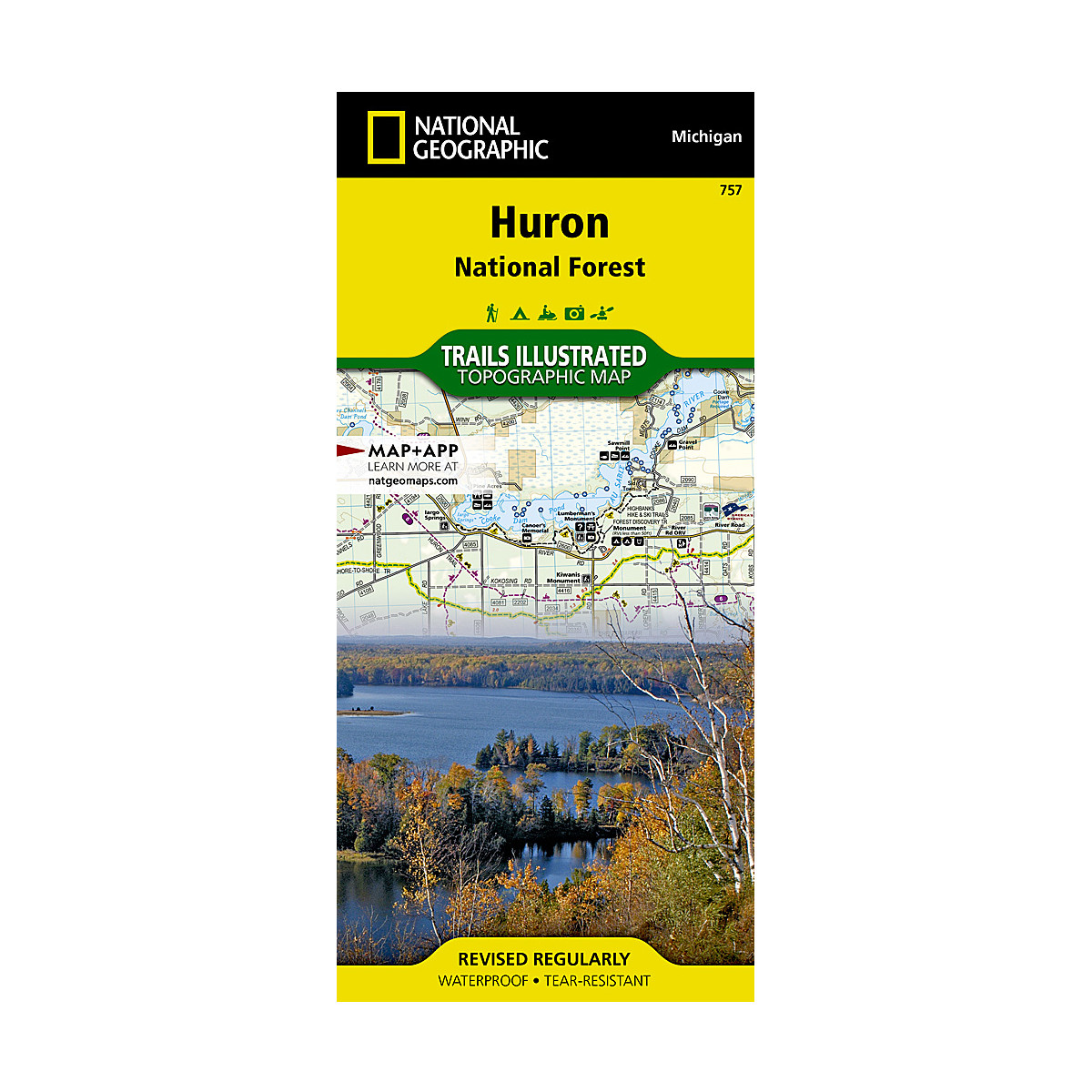 Expertly researched and created in cooperation with the U.S. Forest Service, Michigan Department of Natural Resources and others, National Geographic's Trails Illustrated map of Huron National Forest is an essential travel companion for outdoor enthusiasts exploring this area in northeast lower Michigan. The map's coverage includes popular recreation areas, such as Au Sable National Scenic River; South Higgins Lake, Tawas Point and Harrisville State Parks; Sturgeon Point Scenic Site; Hubbard, Sand and Round Lakes; River Road Scenic Byway; and Lake Huron. To assist in your finding a recreation area suiting your interests, all trails are clearly labeled according to their designated usage, whether exploring on foot, skis, bicycle, ATV, motorcycle, horseback or snowmobile. Many trails are shown with mileage markers, including the Midland to Mackinac Trail, Michigan Cross Country Cycle Trail (MCCCT) and Michigan Shore-to-Shore Trail, which are all highlighted. Tables show distances of key points of interest along the Au Sable River. The river is shown with its dams and recreation opportunities, including beaches, boat ramps and areas for picnics, primitive camping, river access, fishing, swimming and tubing. Some of the other recreation features in the area are trailheads, campgrounds, public cabins, lighthouses and points of interest of the Jack Pine Wildlife Viewing Tour.