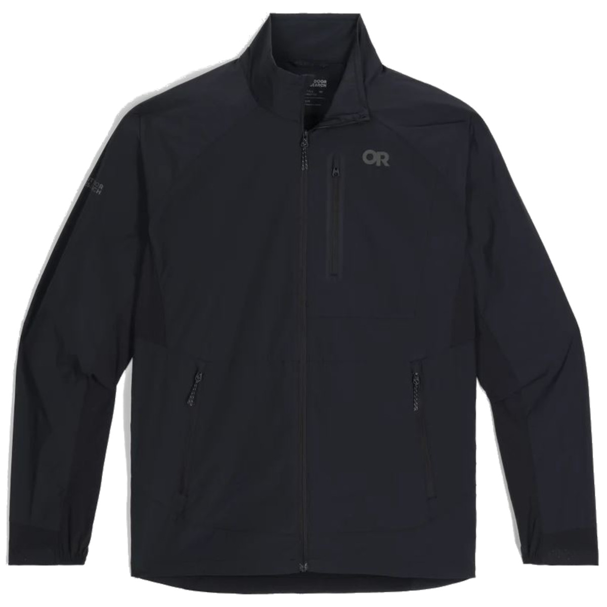 The Men's Outdoor Research Deviator Wind Jacket features a hybrid-mapped construction that prioritizes weather protection at the front body, shoulder, and collar and breathability at the back and underarms, creating the perfect layer for trail running, mountain biking, or any other high-tempo outdoor activity.