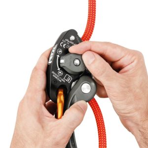 - 3:1 mechanical advantage of the handled camming mechanism helps control rope feed on small-diameter ropes and requires less effort on the handle for large-diameter ropes