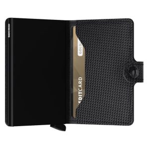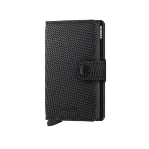 The weave pattern of carbon fibres inspired this treatment of the leather surface. Small in size and surprisingly large in storage capacity, the Miniwallet combines the best of both worlds. The exterior holds banknotes, receipt and cards, while the aluminium Cardprotector allows you to slide out cards with one simple motion and protects them from bending, breaking and unwanted wireless communication.