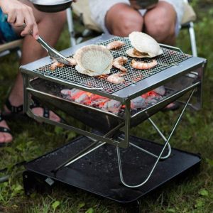The Takibi Fire and Grill is made of durable stainless steel and designed in Japan for a lifetime of use. Packable, portable and modular, use the Takibi Fire and Grill to create a gathering anywhere. The five-piece set includes Grill Net, Grill Bridge, Pack & Carry Fireplace L, Baseplate, and Carrying Case. To cook with charcoal, add on the Fireplace Coal Bed (L). The Takibi Fire & Grill received the Good Design Award in recognition of its innovative structure, lasting durability, and ease of use.