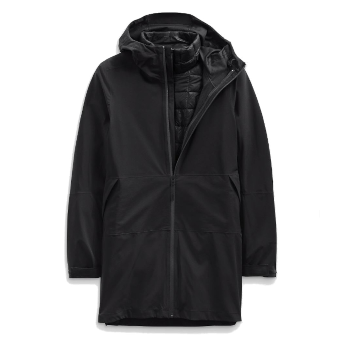 - Attached, three-piece hood with a drawcord for adjustability