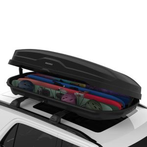 Load up and Go! From road trips with pets to camping with your friends who bring way too much stuff. Make more room inside your vehicle with the SkyBox NX. This do it all cargo box is packed with features like worry-free mounting hardware that fits most crossbars, a flat bottom interior so you can take full advantage of more usable space, and the dependability and security of full metal locking handles. 18 cubic feet of cargo space!